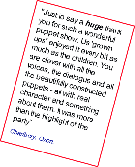 "The children had a lovely time and your puppets and puppeteering are magical. I for one will remember the Loch Ness Monster and crocodile for a long time. My daughter liked Bouncer best"