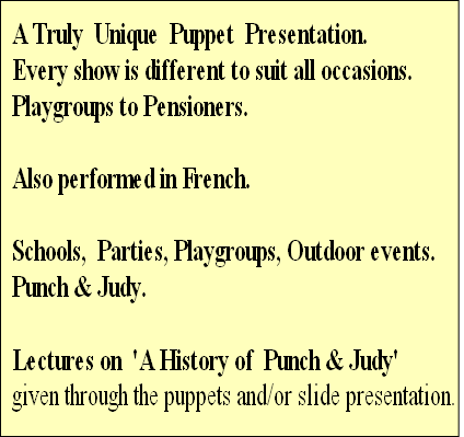 In schools her French Puppet Shows are popular with Polichinelle instead of Punch. They are done entirely in French and work well even with limited knowledge of the language. A true French Punch & Judy Show!